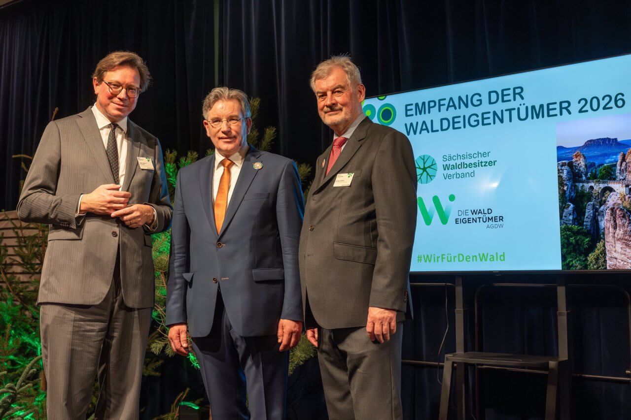 AGDW-Präsident Prof. Andreas Bitter, Staatsminister Georg-Ludwig von Breitenbuch und Georg Lindner, Präsident des Sächsischen Waldbesitzerverbandes auf der Bühne beim Empfang der Waldeigentümer, Bildquelle: AGDW/Sebastian Runge