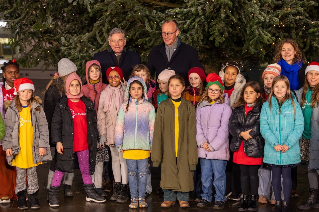Foto: AGDW-Präsident Prof. Andreas Bitter mit Bundeskanzler Friedrich Merz mit dem Kinderchor Vokalhelden bei der Übergabe des Weihnachtsbaumes der Waldeigentümer im Ehrenhof des Bundeskanzleramtes. Bildquelle: AGDW/Runge